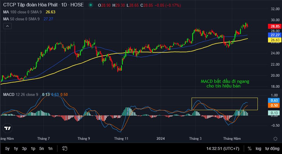 Chỉ báo MACD bắt đầu đi ngang trong phiên giao dịch ngày 24/05/2024 và có nguy cơ cho tín hiệu bán trở lại. Vùng 25,000-27,000 (tương đương đỉnh cũ đã bị vượt qua của tháng 09/2023) sẽ hỗ trợ tốt cho giá nếu đà giảm quay trở lại. Khối lượng giao dịch vẫn nằm trên mức trung bình 20 ngày cho thấy nhà đầu tư không quá bi quan.