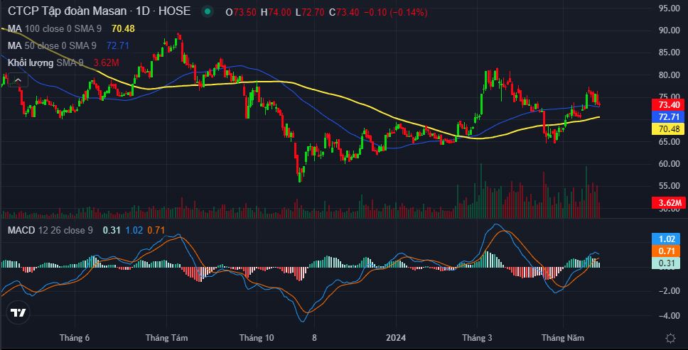 Khối lượng giao dịch MSN vượt mức trung bình 20 ngày cho thấy nhà đầu tư vẫn đang giao dịch khá sôi động. Nến xanh đỏ xuất hiện xen kẽ nhau trong thời gian gần đây cho thấy quá trình giằng co và rung lắc sẽ còn tiếp diễn. Giá đã vượt qua đường Middle của Bollinger Bands và MACD vượt mức 0 nên triển vọng ngắn hạn không quá bi quan.