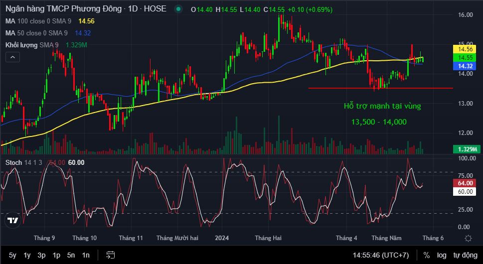 Giá đang dao động xoay quanh đường SMA 50 ngày và SMA 100 ngày nên xu hướng không rõ ràng. Đáy cũ tháng 04/2024 (tương đương vùng 13,500-14,000) sẽ đóng vai trò hỗ trợ mạnh nếu giá giảm trở lại.