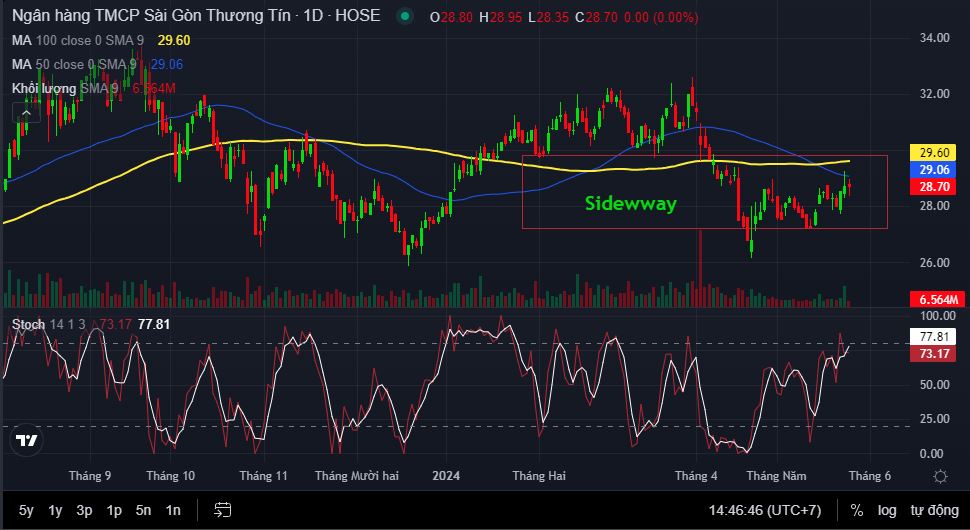 Quá trình dịch chuyển ngang (sideways) chưa thể kết thúc khi kênh giá đi ngang chưa bị phá vỡ hoàn toàn. Chỉ báo Stochastic Oscillator đã cho tín hiệu bán nên tình hình khá tiêu cực. Đáy cũ tháng 12/2023 (tương đương vùng 26,000-28,000) sẽ là hỗ trợ mạnh nếu đà giảm quay trở lại.