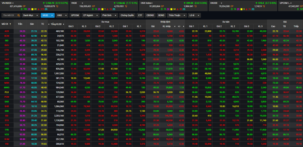 Màu xanh lá cây: màu biểu trưng mức giá khớp lệnh đang cao hơn giá tham chiếu